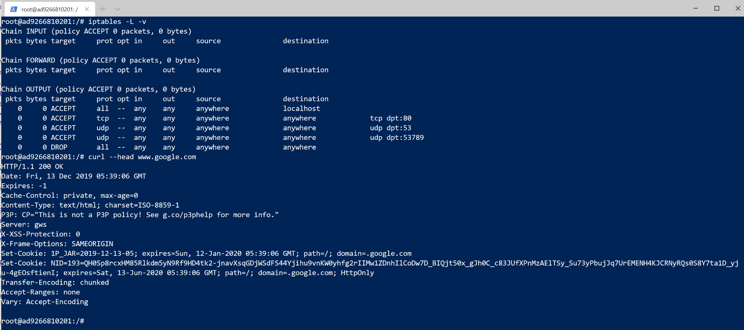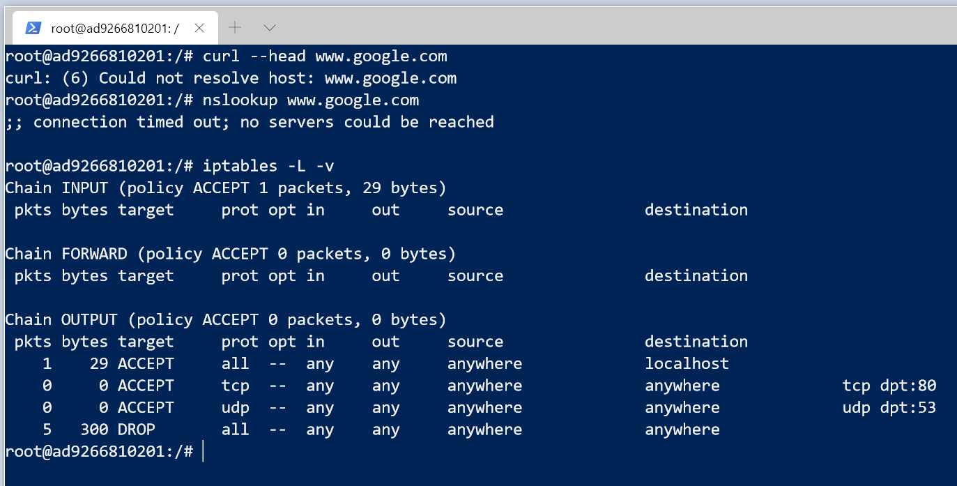 It will obviously need to send packets with destination port 80, and packets with destination port 53 so it can make DNS requests to resolve http://www.google.com. So let’s implement a quick setup with iptables to accomplish this. We’ll use the following Dockerfile that installs curl, iptables, and dnsutils on top of the default Ubuntu image, so we can test our scenario.