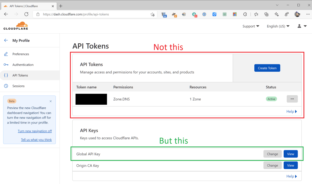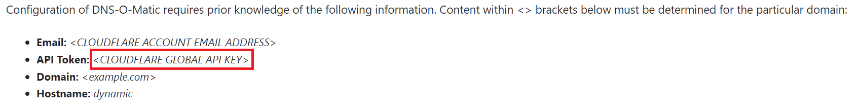 This is actually clear in Cloudflare’s documentation on how to set up DNS-O-Matic, although I think it needs to be more explicitly stated that you’re not supposed to use the Cloudflare thing with the same name that the DNS-O-Matic form has. Maybe the documentation predates the implementation of API Tokens on Cloudlflare’s side and that’s why the terminology isn’t the clearest.